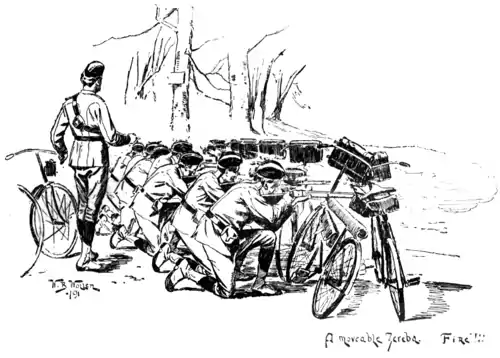 This is for the purpose of resisting cavalry, and is formed by some twenty or thirty machines, which are stacked on to one another; the men getting behind the cycles and firing at the approaching enemy. So clever are they at forming these cycling squares, so to speak, that the whole thing can be accomplished in some five or six seconds. Indeed, taken all round, the military cyclist is not only a very ingenious fellow, but a good way ahead of the ordinary infantry men; in fact, he is really an infantry man on temporary wheels; for, when engaged in fighting, he dismounts