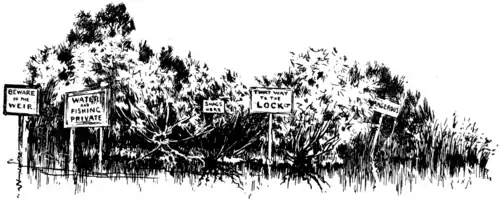 in the Ear: "'Tis I that have set up these Notices, and you are to know that this Piece of Water in which they are placed is by no means mine, for the which Reason seeing I may hardly venture to set down the Words 'Private Water,' lest some busy Fellow would be challenging the Claim; yet when I say 'Water and Fishing Private,' I do but state the Fact that it is Water, and the Fishing is private, for I have hired it (for no consideration) of the Public, who rightfully own the Water but are too besotted to enforce their Claim. Next Year," continued the worthy old Gentleman, "I propose to stretch a Wire across this Water, and thereafter a stout Chain; so in the Course of Years the Water shall become of right my private Property. In like wise the Words 'Dangerous,' and 'That Way to the Lock,' and 'Beware of the Weir,' are cunningly designed to hinder the vulgar from entering upon that Piece of Water; for you should know that, as there is no Danger, nor any Weir, so, also, either Way conducts to the