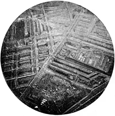 of hop-poles. We have crossed the river, and below us is a large green plan, traversed by geometrical white lines. It is Battersea Park. Again we reach for the camera, and have another picture, taking in the park and the river beyond, and as much as possible of the town beyond that, slightly obscured by light wreaths of smoke. And now our direction changes. The lower currents of air have been variable, and we have been travelling in a different direction to that taken by the clouds overhead. Now, however, all winds seem to join from the south-west, and we recross the river. Far, far away below us are myriad roofs—it is Pimlico—and of these we take a photograph, as we hang somewhere over Grosvenor Station, just before the throwing out of certain ballast, which causes a rapid ascent. The streets may well be recognised in the photograph. Stretching right across in an oblique direction, almost through the middle of the picture is Lupus-street. Crossing it may be seen Denbigh-street and Claverton-street, while, on the left, lying parallel, and joining Lupus-street at a different angle to Denbigh-street, are St. George's-road, Cambridge-street, with its church, Alderney-street and Winchester-street. Ranelagh-road and Rutland-street may be seen on the right.