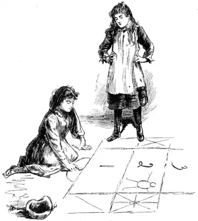 vogue in the north and west of London than in the east. The accompanying illustration shows the figure that is drawn in chalk on the pavement, the two side loops being for the player's marks. Should there be three or four players, the figure is made longer with an additional number of lines, and there are extra side loops; the game is, however, usually played by two persons. The bit of china is put on the bottom line and "nicked," or "spooned," along with the finger. If it rolls on, say, 2, the player draws a mark in the side loop nearest 2 from opposite corners. The other player has then a turn, each player going in alternately. The second time the player's china goes on the same number a line across the opposite corners is drawn; the third time this occurs a line is drawn across the middle of the square horizontally, and the fourth time perpendicularly. Here the real pleasure of the player begins.