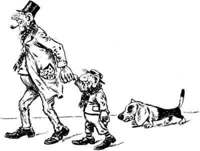 The comic model, his son, and dog trudging to work.
