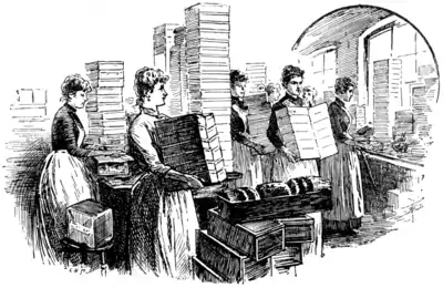 On the floors above, the printing is going on. A number of litho machines are running, for the most part presided over by men assisted by girls, who certainly take off the sheets with marvellous rapidity. One machine is printing funny faces to go outside the crackers, another is turning out sheets with hundreds of flowers on it, and yet another is giving us countless little Cupids. Every rose and Cupid is cut out, and it is the same with any other picture with which it is intended to decorate a cracker.