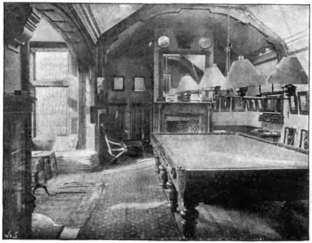The landings are lined with many portraits of Norfolk worthies; the walls are decorated with African horns. This huge bull's head belonged to an animal shot by Mr. Fred Jackson, the explorer. Here stands a quaint old cabinet. It is exquisitely carved, and was the property of Lady Smith, who inherited it in her youth, and died at the age of a hundred and four. It is said to contain forty secret drawers, a score of which yet remain to be discovered. The billiard-room is exceptionally interesting. An oil-painting of Mrs. Haggard, by Kerr, hangs here, and on one side of the room are the original drawings by Greiffenhagen for an, as yet, unpublished edition of the novelist's "World's Desire." Greiffenhagen's work is marvellously real. His "She" pictures, which hang downstairs, are exceptionally striking black-and-whites. In a niche of the billiard-room—somewhat hidden from view—is a desk of Charles Dickens. It was bought at the Gad's Hill sale. Close by is a little cabinet. The glass door is opened, and from a tiny silver Icelandic Communion cup a number of rings are put into my open hand. One of the most striking of these is a gold band, thousands of years old, with hieroglyphics engraved upon it signifying "Haggard" (as an Egyptian might have written it) "the Scribe makes an offering to the God of Dawn." Another gold ring is from the mummy of Queen Taia, the feminine Henry VIII. of Egypt, and one of the most fascinating and beautiful women that ever lived, Its inscription