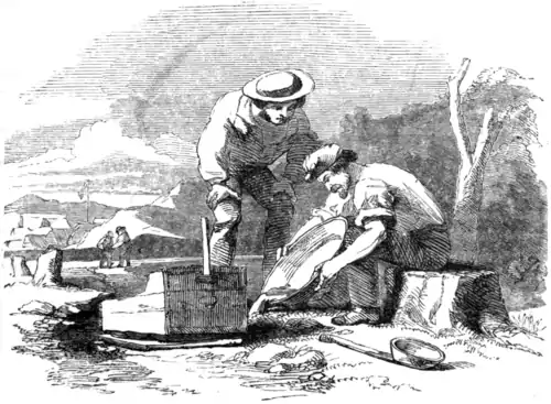 {{fine block|during the last several months, and the population has almost deserted them. At one time there must have been nearly 2,000 persons on Major's and Bell's Creeks and at Araluen; but at present there are not, at most, more than 500. The average earnings at these diggings approximate to those at the Turon, and, as at the latter place, many instances of surprising good fortune have occurred. At Mungarlow, some fifteen or twenty miles from Major's Creek, remunerative diggings have been opened, and several nuggets have been found weighing up to eight or ten ounces. At the Braidwood diggings the gold is generally fine, and it is reckoned to be very pure. Dry diggings have been opened on Major's Creek, in which many parties are procuring four or five ounces of gold a day.