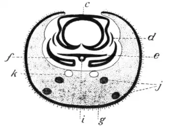 c, Labrum-epipharynx; d, mandible; e, hypopharynx; f, maxillæ; g, labium; i, sailvary duct; j, muscles; k, trachea.