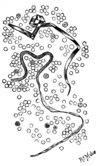 species of mosquito[1] which have fed on the blood of a filaria-infested individual be examined immediately after feeding, the blood contained in the stomach of the insects will be found to harbour large numbers of living microfilariæ. If one of these mosquitoes be examined three or four hours after it has similarly fed, it will be found that the blood corpuscles have in great measure parted with their hæmoglobin, and