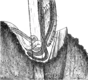 Fig. 105.—Larval filariæ (Dirofilaria immitis) leaving proboscis of mosquito and burrowing through the skin. (Partly diagrammatic, after Fülleborn.)