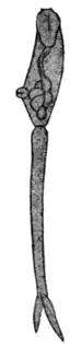 | Fig. 138.—Bilharzia hæmatobia cercaria Bulinus species. (Leiper.) | Fig. 139.—Bilharzia mansoni cercaria in Planorbis boissyi. (Leiper.) |