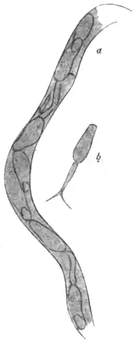 In a case from Katayama, described by Tsunoda and Shimamura, the necropsy revealed, besides the ordinary lesions in the liver, intestine, and pancreas, thickening with hæmorrhagic infiltration of both the dura and pia mater. In the brain itself a number of wedge-shaped sclerosed areas of greyish colour, and surrounded by some ecchymosis, were found. In the lenticular nucleus, optic thalamus, and internal capsule of the left side there was an area of softening the size of a walnut. On histological examination these areas were found to contain ova embedded in neuroglia and surrounded by softened and degenerated brain tissue. Similar ova were found in the membranes, and a few in the right hemisphere and in the choroid plexuses of the lateral ventricles. In connection with these lesions the