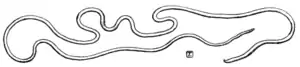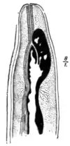 1·7 mm. The body is cylindrical, milky-white, smooth, and without markings. The tip of the tail comes to a point and is abruptly bent, thus forming a sort of blunted hook, perhaps functioning as a "holdfast." The head end is rounded off, terminating in what is known as the cephalic shield. The mouth is triangular, very small, and surrounded by six papillæ—two large and four small The alimentary canal is relatively small, being compressed and thrust to one side by the uterus; in the mature worm it is probably cæcal, for it has not been traced to an anus. Nearly the whole of the worm is occupied by the uterus, which is packed from end to end with coiled-up embryos. The vagina also may be lacking. According to Looss, the uterine tubes (he states, contrary to Leuckart, that there are two) open into the posterior part of the œsophagus by a common duct, the œsophagus prolapsing through the mouth at the time of parturition and being subsequently withdrawn. Leiper, however, has shown that the worm discharges its young by a prolapse of the uterus as described by me, and that the extrusion does not occur through the mouth, as suggested by Looss and myself, but by a rupture just outside the circumoral ring of papillæ, possibly the vagina.