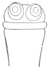 small (1·38 mm. broad by 0·47 mm. long), and is provided with an apical sucker (0·16 mm.) in addition to the usual four suckers (0·63 mm.). The neck is very short, and somewhat broader than the scolex. The proglottides are all broader than they are long. Immediately at the back of the scolex they measure 0·16 mm. in length by 1·78 mm. in breadth and 0·59 mm. in thickness; about the middle of the strobila they are 3 mm. long by 9 mm. broad and 1·20 mm. thick. The terminal and gravid strobilæ are 7 mm. long by 12 to 15 mm. broad and 1·35 mm. thick. The genital pores alternate irregularly, and are placed in the middle of the border of each segment. The testicles are very numerous and scattered throughout the middle layer. The vas deferens is much convoluted. The cirrus pouch is pyriform and thick-walled. The cirrus and vagina are beset with bristles directed outwards. The receptaculum seminis is fusiform. The ovary consists of two fan-shaped wings, composed of club-shaped tubes centring towards the shell-gland; the latter is median and globular. The uterus includes a median stem and 15 to 24 lateral, unramified branches, which are longer than the stem, and spread out like a fan. The ova are spherical, the embryophore 31 to 39 by 33·8 μ, with thick radially-striated shell; hooks of the onchosphere measure 7·8 μ in length.