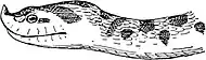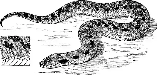Length, thirty inches; light gray-brown with reddish-brown or black spots, sometimes almost black. Does not try to get away like most snakes, but spreads itself out flat on the ground, thus appearing double its size, and hisses. A very ugly looking snake, but said not to be dangerous, having no poisonous fang teeth.