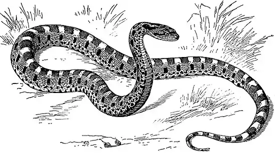 Length, fifty inches; gray, with red-brown black-bordered blotches; belly black, or white with square black spots.