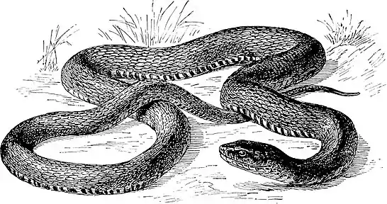 Length, sixty inches; deep, dull black; some scales, with white edges; belly, slate color; rough.