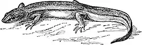Length, three-and-one-half inches; greenish or reddish-brown; light-yellow underneath; row of red dots on sides, and small black dots on belly; tail, flat. Aquatic.