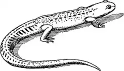 Length, five inches; orange-yellow, with black spots; tail much longer than body. Found in subterranean caves.