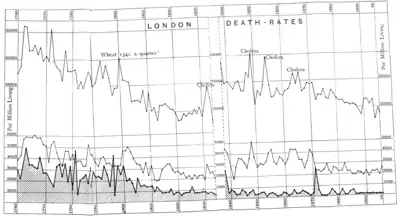 The Middle line shows rates of Death from Zymotic Diseases, including Measles, Fevers. Whooping-cough, and Diphtheria.