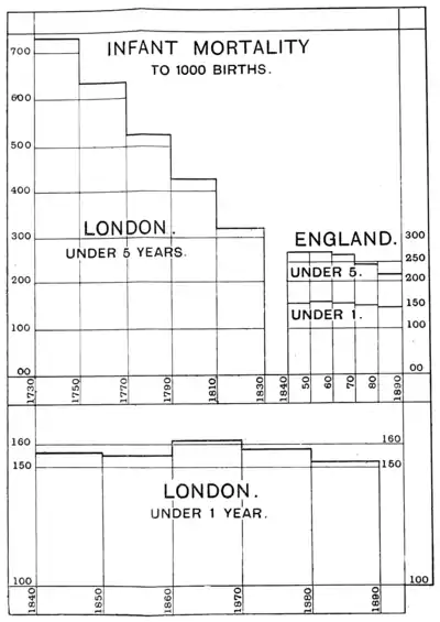 The upper portion of this diagram shows the Infant Mortality of London from 1730 to 1830, from Dr. Farr's tables in McCulloch's Statistical Account of the British Empire, vol. ii, p. 543 (1847). From 1840 to 1890 shows the Infant Mortality of England calculated from the Reports of the Registrar-General (see 3rd Report. p. 197, Table O). Materials for the continuation of Dr. Farr's London Table (under 5 years) are not given by the Registrar-General.