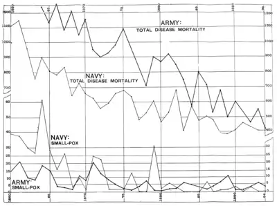 Lower Thick line shows the Small-pox mortality per 100,000 in the Army.