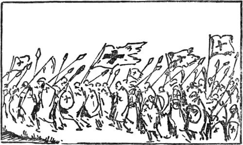 In the year 1096 this second crusade started upon its long voyage. At Constantinople the knights did homage to the Emperor. (For as I have told you, traditions die hard, and a Roman Emperor, however poor and powerless, was still held in great respect). Then they crossed into Asia, killed all the Moslems who fell into their hands, stormed Jerusalem, massacred the Mohammedan population, and marched to the Holy Sepulchre to give praise and thanks amidst tears of piety and gratitude. But soon the Turks were strengthened by the arrival of fresh troops. Then they retook Jerusalem and in turn killed the faithful followers of the Cross.