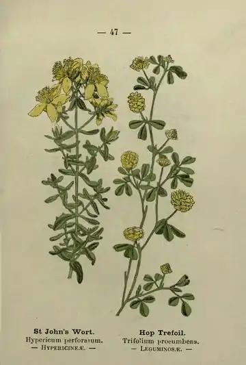 St John's Wort. Hypericum perforatum. HYPERICINE.E. Hop Trefoil. TrifoUum procumbens. LEGUMINOS^.