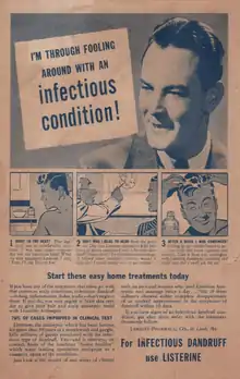 Listerine, the antiseptic which has been famous for more than 50 years as a mouthwash and gargle, kills millions of germs associated with the infectious type of dandruff. Yes—and it destroy, on contact, hosts of the insidious "bottle bacillus" which many leading specialists recognize as a caiuative agent of the condition.
