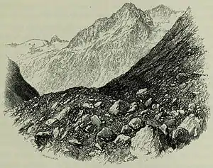 suggestive of chaos, but of little else; covered almost throughout its entire length with débris from the size of a walnut up to that of a house; in a word, it looked as if half-a-dozen moraines of first-rate dimensions had been carted and shot into it. Our tempers were soured by constant pitfalls [it was impossible to take the eyes
