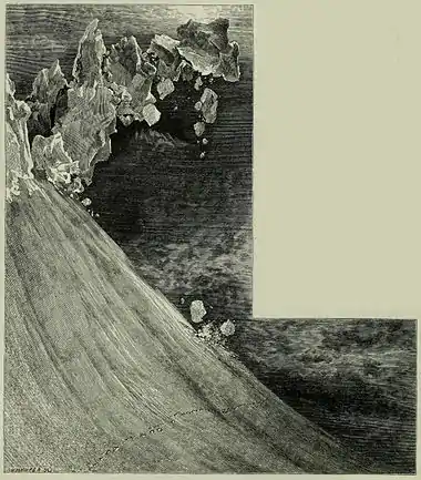 We got to the rocks in safety, and if they had been doubly as difficult as they were, we should still have been well content. We sat down and refreshed the inner man; keeping our eyes on the towering pinnacles of ice under which we had passed; but which, now, were almost beneath us. Without a preliminary warning sound, one of the largest—as high as the Monument at London Bridge—fell upon the slope below. The stately mass heeled over as if upon a hinge (holding together until it bent thirty degrees forwards), then it crushed out its base, and, rent into a thousand fragments, plunged vertically down upon the slope that we had crossed! Every atom