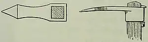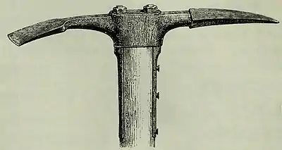 Mr. T. S. Kennedy (of the firm of Fairbairn & Co.), whose practical acquaintance with mountaineering, and with the use and manufacture of tools, makes his opinion particularly valuable, has contrived the best that I have seen; but even it seems to me to be deficient in rigidity, and not to be so powerful a weapon as the more common kind with the fixed head. The simple instrument which is pie instrument which is shown in the annexed diagram is the invention of Mr. Leslie