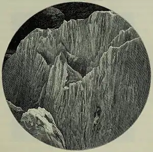 faces with graceful sinuosities.[1] As night came on, their music died away, the rivulets dwindled down to rills; the rills ceased to murmur, and the sparkling drops, caught by the hand of frost, were bound to the ice, coating it with an enamelled film which lasted until the sun struck the glacier once more.