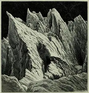 The weathering of the walls of crevasses, which obscures the internal structure of the glacier, has led some to conclude that the stratification which is seen in the higher glacier-regions is obliterated in the lower ones. Others, Agassiz and Mr. John Ball for example, have disputed this opinion,[1] and my own experiences accord with those of these accurate observers. It is, undoubtedly, very difficult to trace stratification in the lower ends of the Alpine glaciers; but