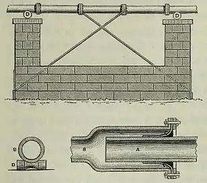 of the ordinary pipe, makes the joint sufficiently air-tight, although it does not hinder the advance or the retreat of the pipe. In the tunnel itself—where the temperature is not subject to such fluctuations—these precautions are not necessary, and the pipes are carried along the walls, supported by brackets, as far as the end of the finished work. Through these pipes highly compressed air is conducted, and is delivered at the end of the "advanced gallery" where the boring-machines are at work, with only a slight diminution in its pressure, notwithstanding the escapes which occur at the joints.