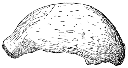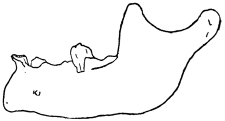 "On the 23rd of March, 1863, some four years after a few of the leading archæologists of France and England had come to recognize the truth of Dr. Falconer's opinion, a workman engaged in digging gravel near a windmill called Moulin-Quignon, in the suburbs of Abbevilie, came to inform M. Boucher de Perthes that a small portion of a bone was to be seen projecting from the face of a cutting then in progress. He and a friend (M. Dimpre) went on at once to the spot and witnessed the extraction of the bone, which proved to be a human mandible (Fig. 3). It was embedded in a dark sandy ferruginous seam, almost in contact with the underlying chalk; four and a half metres from the surface, and thirty metres above the level of the Somme. Associated with this bone were some flint implements of the usual types, which were then unsuspiciously accepted as genuine relics. The news of this discovery caused great excitement among leading anthropologists on both sides of the Channel, and many of them at once visited the locality.
