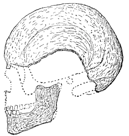 The skull was originally found by workmen, broken up by them, and most of the pieces thrown away on the spot. As many fragments as possible were subsequently recovered by the authors, from which the skull was restored. Half of a human mandible was found in a patch of undisturbed gravel by Mr. Dawson close to the place where the skull occurred. From the abstract in the Society's Proceedings are taken the following descriptive extracts: