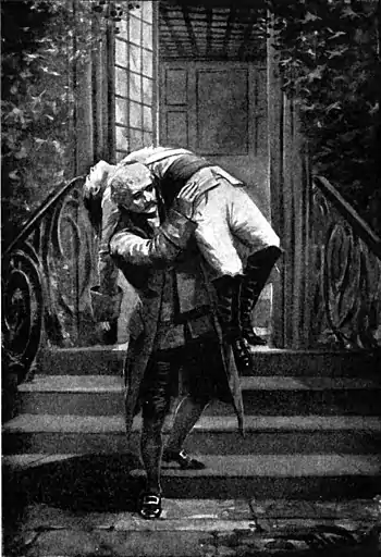 With this, he took up his lantern and mounted a steep, tortuous narrow staircase, above which the great black walls of the château loomed forbiddingly. There was a wicket in an old iron-sheathed door at the stair's head, and when they had passed through it, they stood in a vast hall, the walls of which were covered with rusting armour. But the place was forsaken and unlighted, save for the poor rays which fell from the candle in the lantern; and, indeed, the whole house was full of a silence as of the silence of death. It was a tremendous relief to Eugène when at last he entered the great salon and beheld his brother standing near the door to receive him. Every suspicion, every doubt, all the horrid stories he had heard at the Hôtel Beautreillis, were forgotten in a moment. Kinship, even affection, succeeded to them during the instant of warm welcome.