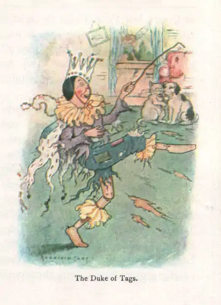 "Rise up, Lady Meg and Lady Peg and Lady Kilmanskeg and Lady Ridiklis of Racketty-Packetty House-and also the Right Honorable Lord Gustibus Rags!" And they all jumped up at once and made bows and curtsied to each other. But they made Peter Piper into a Duke, and he was called the Duke of Tags. He knelt down on the big hole in the carpet and each one of them gave him a little thump on the shoulder with the poker, because it took more thumps to make a Duke than a common or garden Lord.