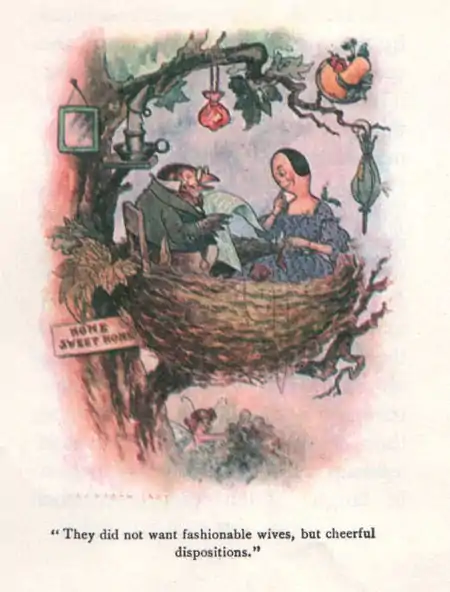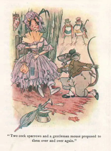 You never saw a family have such fun. They could make up stories and pretend things and invent games out of nothing. And my Fairies were so fond of them that I couldn't keep them away from the dolls' house. They would go and have fun with Meg and Peg and Kilmanskeg and Gustibus and Peter Piper, even when I had work for them to do in Fairyland. But there, I was so fond of that shabby disrespectable family myself that I never would scold much about them, and I often went to see them. That is how I know so much about them. They were so fond of each other and so good-natured and always in such spirits that everybody who knew them was fond of them. And it was really only Cynthia who didn't know them and thought them only a lot of old disreputable looking Dutch dolls—and Dutch dolls were quite out of fashion. The truth was that Cynthia was not a particularly nice little girl, and did not care much for anything unless it was quite new. But the kitten who had torn the lace mantilla got to know the family and simply loved them all, and the Newfoundland puppy was so sorry about Leontine's paint and her left leg, that he could never do enough to make up. He wanted to marry Leontine as soon as he grew old enough to wear a collar, but Leontine said she would never desert her family; because now that she wasn't the beauty any more she became the useful one, and did all the kitchen work, and sat up and made poultices and beef tea when any of the rest were ill. And the Newfoundland puppy saw she was right, for the whole family simply adored Ridiklis and could not possibly have done without her. Meg and Peg and Kilmanskeg could have married any minute if they had liked. There were two cock sparrows and a gentleman mouse, who proposed to them over and over again. They all three said they did not want fashionable wives but cheerful dispositions and a happy, home. But Meg and Peg were like Ridiklis and could not bear to leave their families—besides not wanting to live in nests, and hatch eggs—and Kilmanskeg said she would die of a broken heart if she could not be with Ridiklis, and Ridiklis did not like cheese and crumbs and mousy things, so they could never live together in a mouse hole. But neither the gentleman mouse nor the sparrows were offended because the news was broken to them so sweetly and they went on visiting just as before. Everything was as shabby and disrespectable and as gay and happy as it could be until Tidy Castle was brought into the nursery and then the whole family had rather a fright.