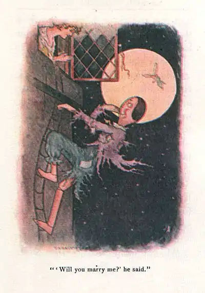 One moonlight night Lady Patsy was sitting at her window and she heard a whistle in the garden. When she peeped out carefully, there stood Peter Piper waving his ragged cap at her, and he had his rope ladder under his arm.