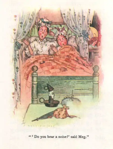 "Do you hear a noise?" said Meg, lifting her head from her ragged old pillow.