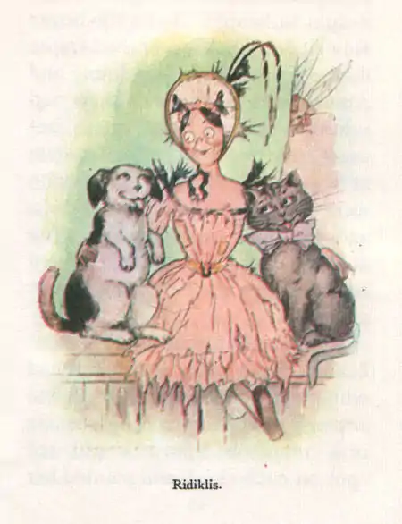 It was just at this minute that Ridiklis came back. The nurse had found her under a chair and stuck her in through a window. She sat on the drawing-room sofa which had holes in its covering and the stuffing coming out, and her one whole leg stuck out straight in front of her, and her bonnet and shawl were on one side and her basket was on her left arm full of things she had got cheap at market. She was out of breath and rather pale through being lifted up and swished through the air so suddenly, but her saucer eyes and her funny mouth looked as cheerful as ever.