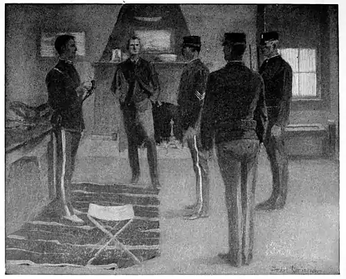 That night, as the sergeant went up the path to the post, a bullet passed through his hat. Clancey was a forceful man, and forceful men, unknown to themselves, make enemies, so he was uncertain as to whether this came from a trooper he had borne upon too harshly, or whether, in the darkness, he had been picked off for someone else. The next night, as he passed in the full light of the post-trader's windows, a shot came from among the dark shadows of the corral, and when he immediately sought safety in numbers among the Indians, cowboys, and troopers in the exchange, he was in time to see Cahill enter it from the other store, wrapping up a bottle of pain-killer for Mrs. Stickney's cook. But Clancey was not deceived. He observed with satisfaction that the soles and the heels of Cahill's boots were wet with the black mud of the corral.