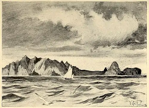 Another asset of the island held out by the prospectus was its great store of buried treasure. Before Harden-Hickey seized the island, this treasure had made it known. This is the legend. In 1821 a great store of gold and silver plate plundered from Peruvian churches had been concealed on the islands by pirates near Sugar Loaf Hill, on the shore of what is known as the Southwest Bay. Much of this plate came from the cathedral at Lima, having been carried from there during the war of independence when the Spanish residents fled the country. In their eagerness to escape they put to sea in any ship that offered, and these unarmed and unseaworthy vessels fell an easy prey to pirates. One of these pirates on his death-bed, in gratitude to his former captain, told him the secret of the treasure. In 1892 this captain was still living, in Newcastle, England, and although his story bears a family resemblance to every other story of buried treasure, there were added to the tale of the pirate some corroborative details. These, in twelve years, induced five different expeditions to visit the island. The two most important were that of E. F. Knight and one from the Tyne in the bark Aurea.