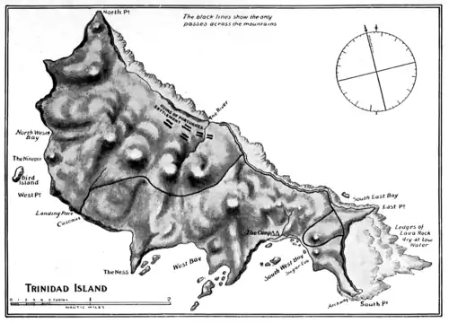 "Trinidad is about five miles long and three miles wide. In spite of its rugged and uninviting appearance, the inland plateaus are rich with luxuriant vegetation.