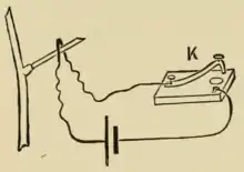or discharged. The plant to be excited is included in the electrical circuit. When K is pressed down, the condenser is charged, the instantaneous charging current passing in one direction. The upper arrow in the diagram shows the direction of this charging current. When the key is released, it springs back and discharges the condenser. The instantaneous discharge current now flows in a reverse direction (fig. 9).