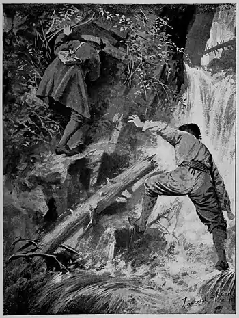 They left their hiding-place shortly before twelve o'clock, but their progress was so slow, crawling, as they had to do, up the steep side of the mountain, under cover of bushes and trees, that it was well after three when they came to the waterfall, which they crossed, as best they could, on stones and logs.
