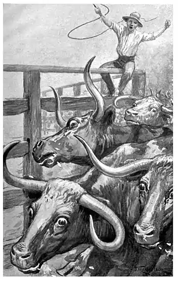 Just for the first moment or two Pip felt a little disinclined to quit the stronghold of his horse's back. The thunder of hoofs and horns, the wild charges made by the desperate animals against the fence, made him expect to see it come crashing down every minute.