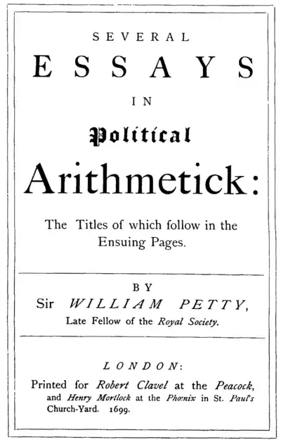 - ↑ Meitzen suggests that the editor was "John Williamson" (probably Sir Joseph is intended), but the suggestion seems to rest solely upon a misreading of Anthony à-Wood. Geschichte der Statistik, 15. Thorpe's Cat. lib. MSS. bibl. Southwellianæ, lot 710, describes a draft of a letter, dated 26 Dec., 1698, from Sir Robert Southwell to Petty's son Henry, afterwards Baron Shelburne, "relative to Sir William Petty's papers, some of which were then reprinting."