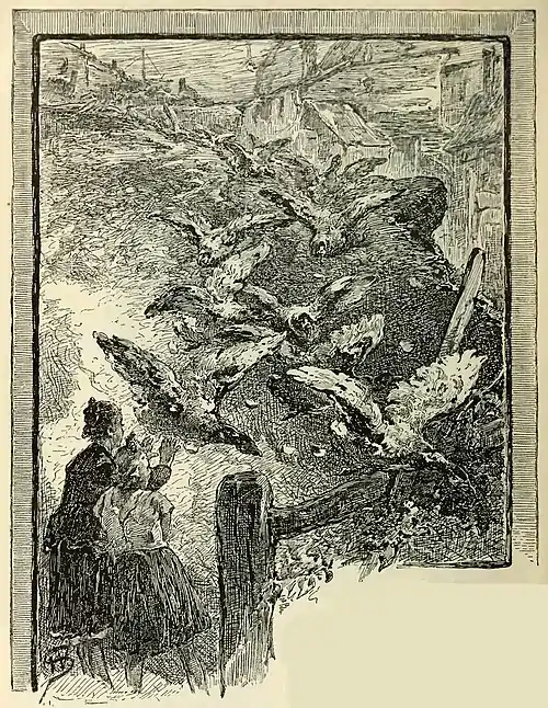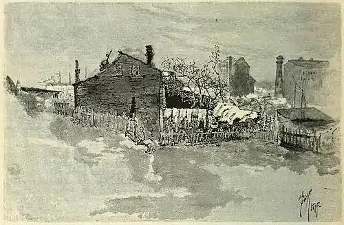 Standing here at Sixtieth street, your eye, turned toward the rising ground where a glimmer of white shows the old Croton aqueduct and the gentle slopes of hills cut right and left by boulevard and avenue, takes in a space just half a mile in length—from Sixty-second to Seventy-second streets—and perhaps an eighth of a mile wide, covered with a huddling host of small houses, mostly one story high, no two on a level. [1] This space is bounded right and left by two avenues, straight as an arrow-flight, and with but slight undulations. It is further transected by streets that run at perfect right angles to the Eighth and Ninth avenues. These sharp lines serve only to mark the strange irregularity of the region. From where we stand, we catch sight of chimneys just peeping above the curb-stones of Seventieth street. A half-dozen blocks nearer, the town mounts an ambitious elevation and sits, a beggarly Rome, hill-enthroned, dominating the surrounding hollows.