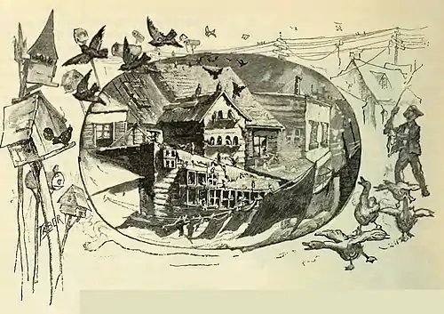 From the station platform we catch, through the trees, a last glimpse of Shantytown. The dark roofs rise high into the golden air; the smoke of wholesome dinners trembles hazily upward; a flash of sunlight against the sky tells of an else invisible bird-house. When we next come here, the houses will be gone, the fires will be cold, and the birds flown. Even now, the smoke-shrouded train rolls down the line, shuts out the picture, and bears us home.