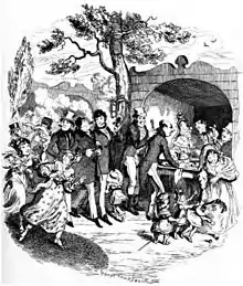 The heat is intense this afternoon, and the people, of whom there are additional parties arriving every moment, look as warm as the tables which have been recently painted, and have the appearance of being red-hot. What a dust and noise! Men and women—boys and girls—sweethearts and married people—babies in arms, and children in chaises—pipes and shrimps—cigars and periwinkles—tea and tobacco. Gentlemen, in alarming waistcoats, and steel watch-guards, promenading about, three abreast, with surprising dignity (or as the gentleman in the next box facetiously observes, ‘cutting it uncommon fat!’)—ladies, with great, long, white pocket-handkerchiefs like small table-cloths, in their hands, chasing one another on the grass in the most playful and interesting manner, with the view of attracting the attention of the aforesaid gentlemen—husbands in perspective ordering bottles of ginger-beer for the objects of their affections, with a lavish disregard of expense; and the said objects washing down huge quantities of ‘shrimps’ and ‘winkles,’ with an equal disregard of their own bodily health and subsequent comfort—boys, with great silk hats just balanced on the top of their heads, smoking cigars, and trying to look as if they liked them—gentlemen in pink shirts and blue waistcoats, occasionally upsetting either themselves, or somebody else, with their own canes.